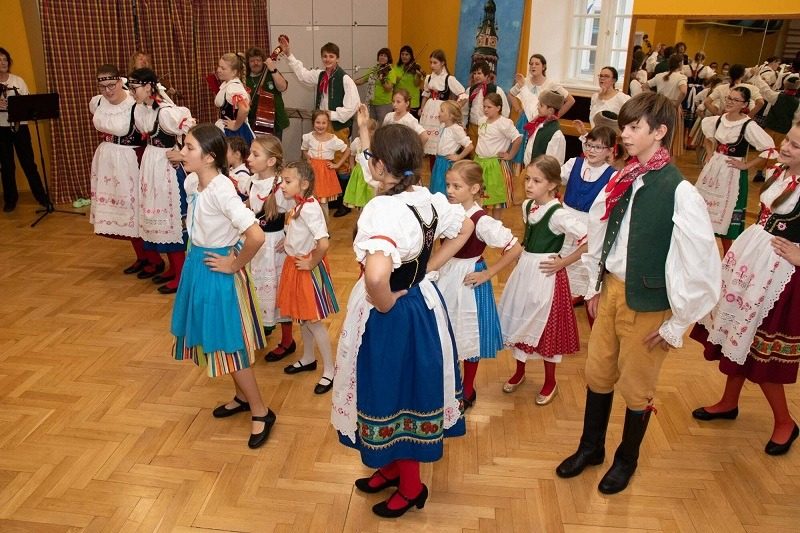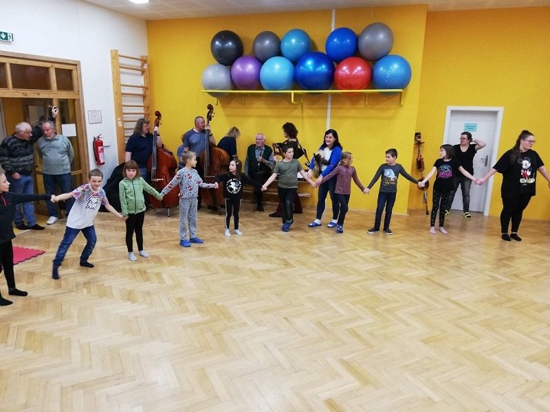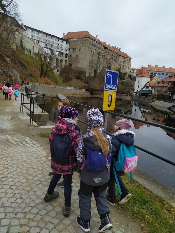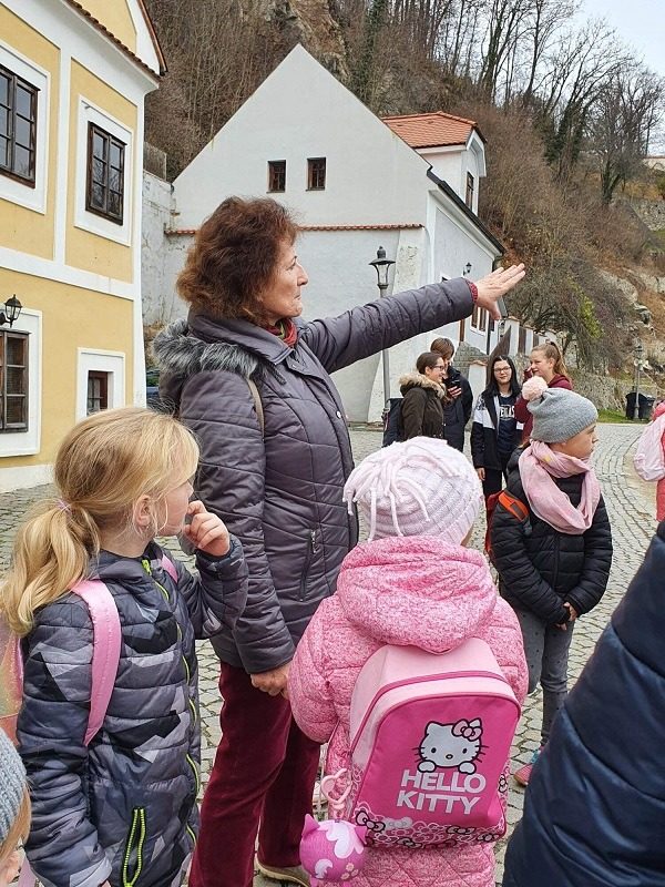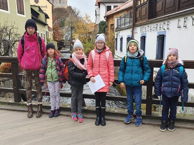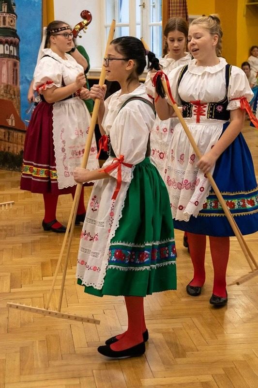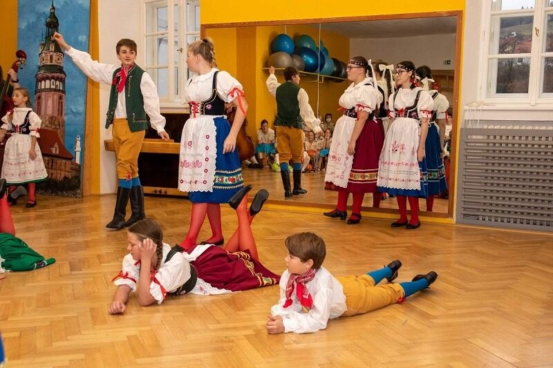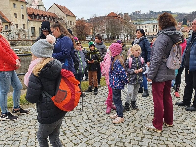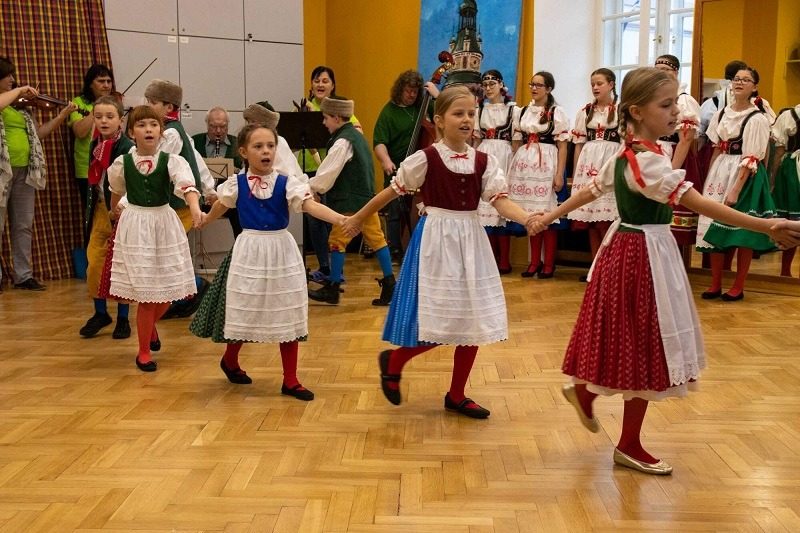 Mohli jsme se konečně za nimi rozjet. Cesta vlakem byla sice dlouhá, ale pro někoho to byl zážitek, neboť to bylo poprvé. Na nádraží na nás čekala dudačka krumlovského souboru Zlatka, která nás vedla večerním městem a temnými zákoutími Krumlova za doprovodu jejího příjemného vyprávění. Po příchodu do domu dětí a mládeže nás čekala doslova hostina a poté hudební hry s nácvikem našeho společného programu. Po nich byl čas uložit se ke spánku. Spát ve spacáku na karimatce vedle svého kamaráda bylo pro mnohé dalším jedinečným zážitkem. Ráno zabalit, nasnídat a vyrazit vstříc historickému městu, kde byla pro oba soubory i jejich muzikanty připravena pátrací hra. Užili jsme si to všichni a našli to, co jsme měli. Po vynikajícím obědě nás čekalo vystoupení pro veřejnost. Povedlo se a my odjížděli s dobrými pocity a dojmy.