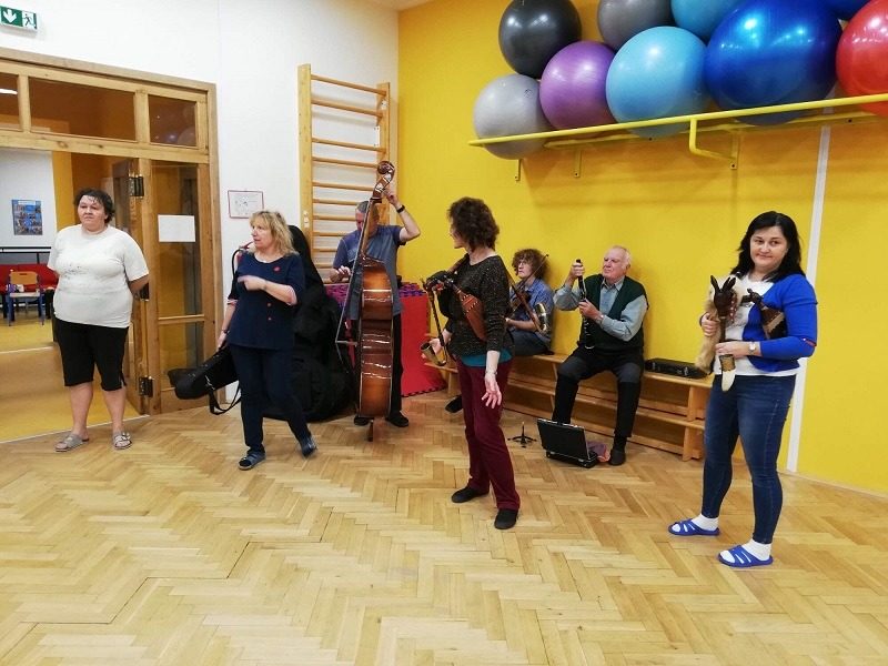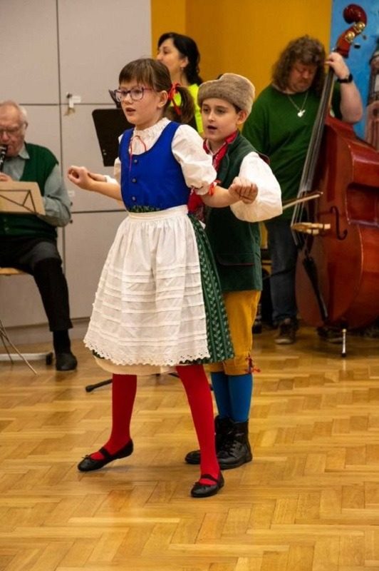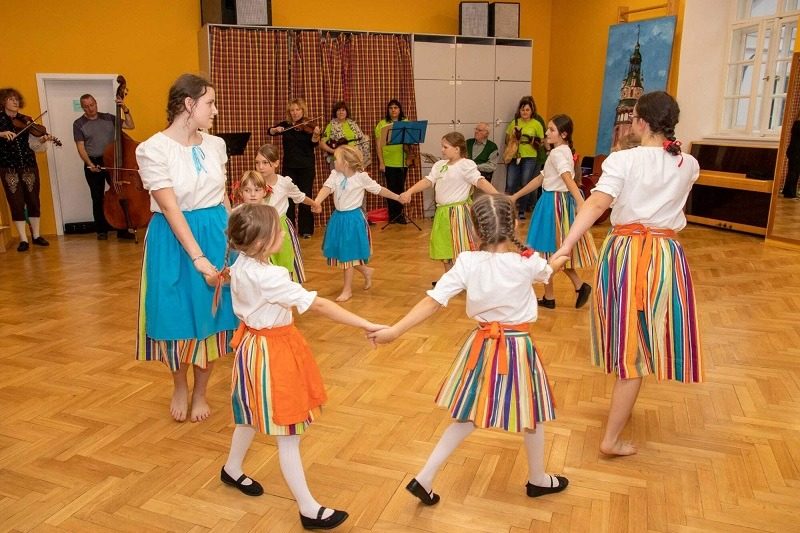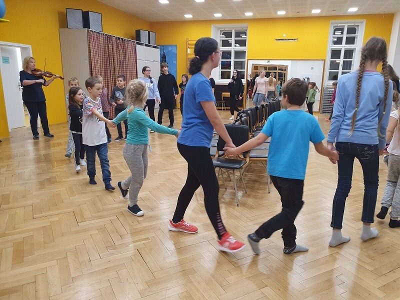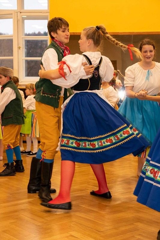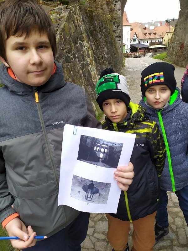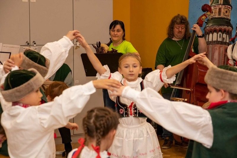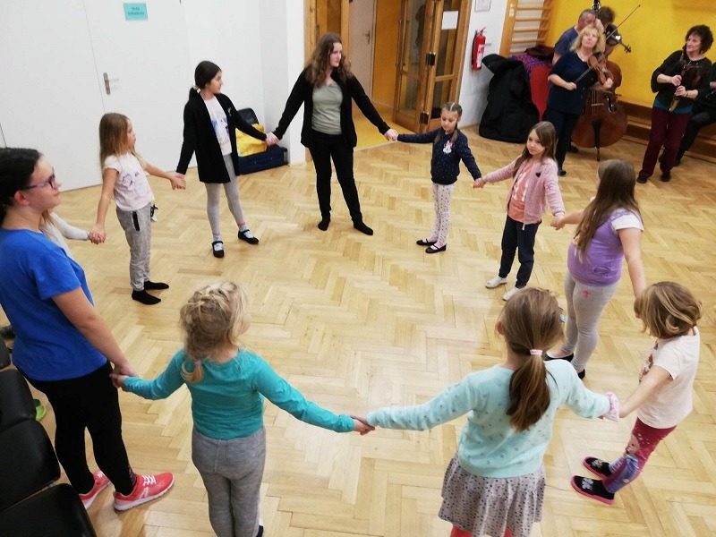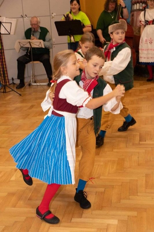 Mohli jsme se konečně za nimi rozjet. Cesta vlakem byla sice dlouhá, ale pro někoho to byl zážitek, neboť to bylo poprvé. Na nádraží na nás čekala dudačka krumlovského souboru Zlatka, která nás vedla večerním městem a temnými zákoutími Krumlova za doprovodu jejího příjemného vyprávění. Po příchodu do domu dětí a mládeže nás čekala doslova hostina a poté hudební hry s nácvikem našeho společného programu. Po nich byl čas uložit se ke spánku. Spát ve spacáku na karimatce vedle svého kamaráda bylo pro mnohé dalším jedinečným zážitkem. Ráno zabalit, nasnídat a vyrazit vstříc historickému městu, kde byla pro oba soubory i jejich muzikanty připravena pátrací hra. Užili jsme si to všichni a našli to, co jsme měli. Po vynikajícím obědě nás čekalo vystoupení pro veřejnost. Povedlo se a my odjížděli s dobrými pocity a dojmy.