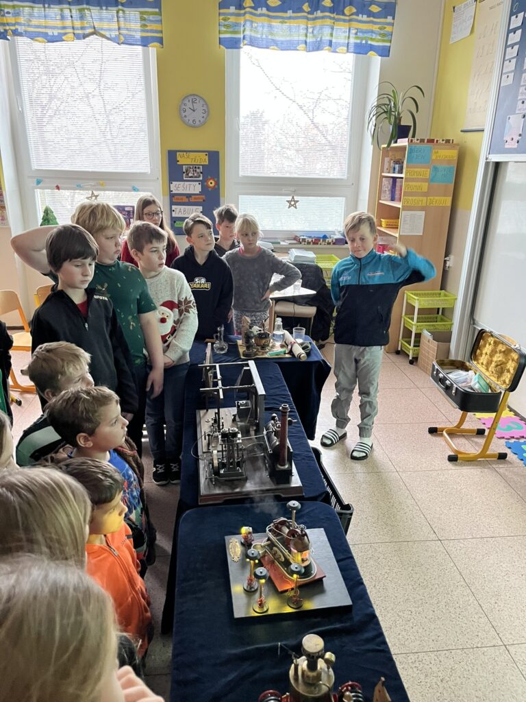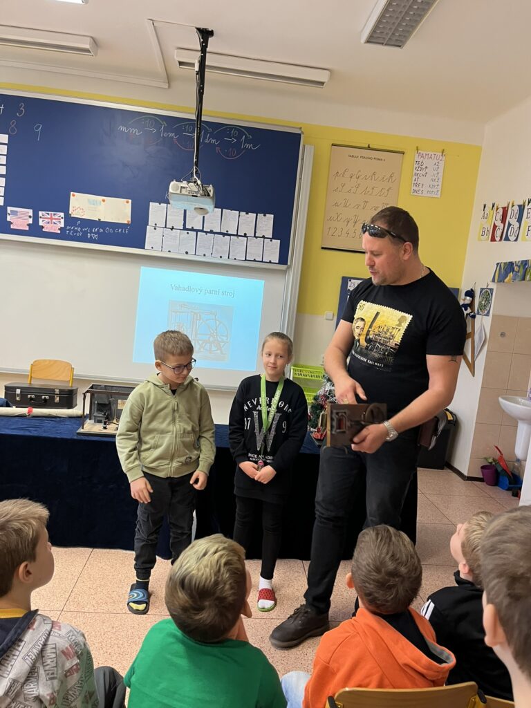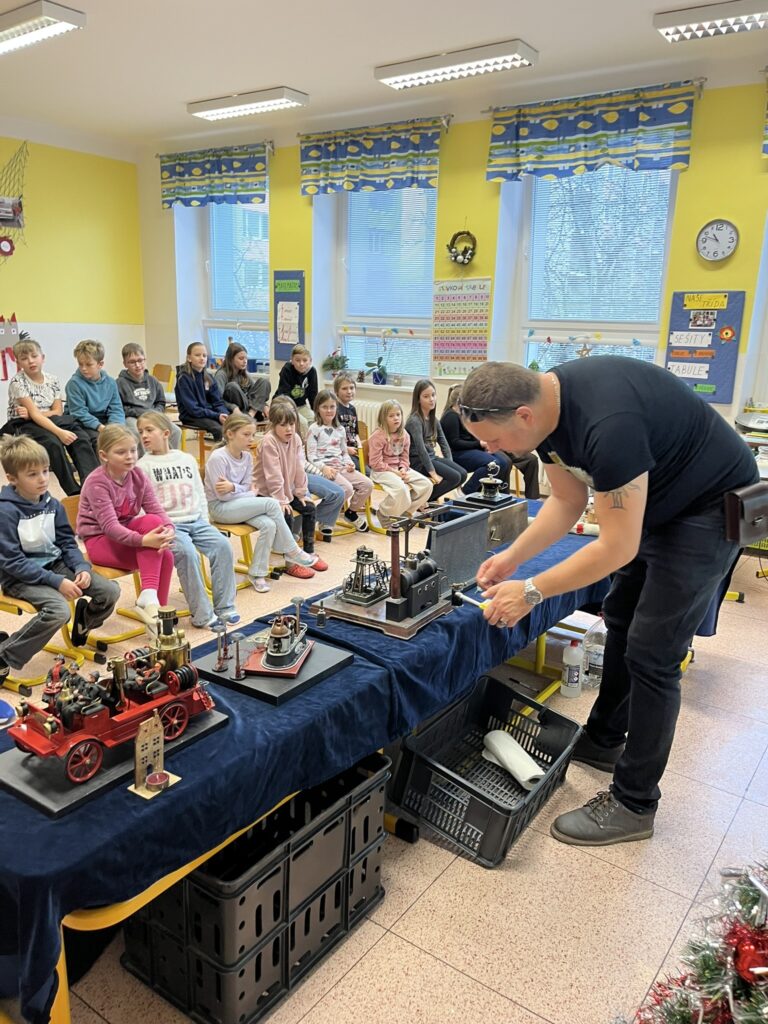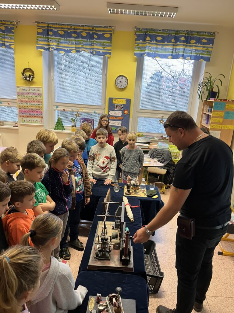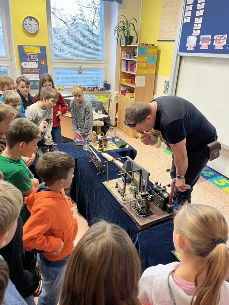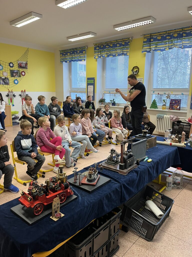 Na naší škole se uskutečnil koncem prosince vzdělávací program s názvem Plnou parou vpřed, který žákům poutavou a originální formou přiblížil fenomén parní energie a její význam v historii lidstva. Tento zábavně-poučný projekt nabídl jedinečný pohled na sílu páry prostřednictvím funkčních modelů, které názorně ukazovaly technický pokrok napříč dějinami. Programu se zúčastnily 3. a 5. třídy společně se třídou 4.B. Celým programem nás provázel Míla Vaváček, jehož nadšení pro téma a poutavý výklad významně přispěly k celkově velmi pozitivní atmosféře akce. Děti měly možnost nejen parní modely zkoumat, ale také se aktivně zapojit. Prezentace parních vynálezů vnesla do dnešní uspěchané doby nostalgické kouzlo starých časů a všichni v tu chvíli zapomněli na novodobou technologii.