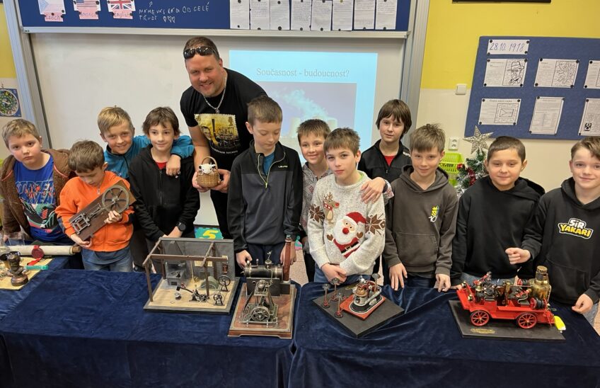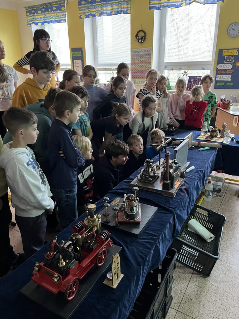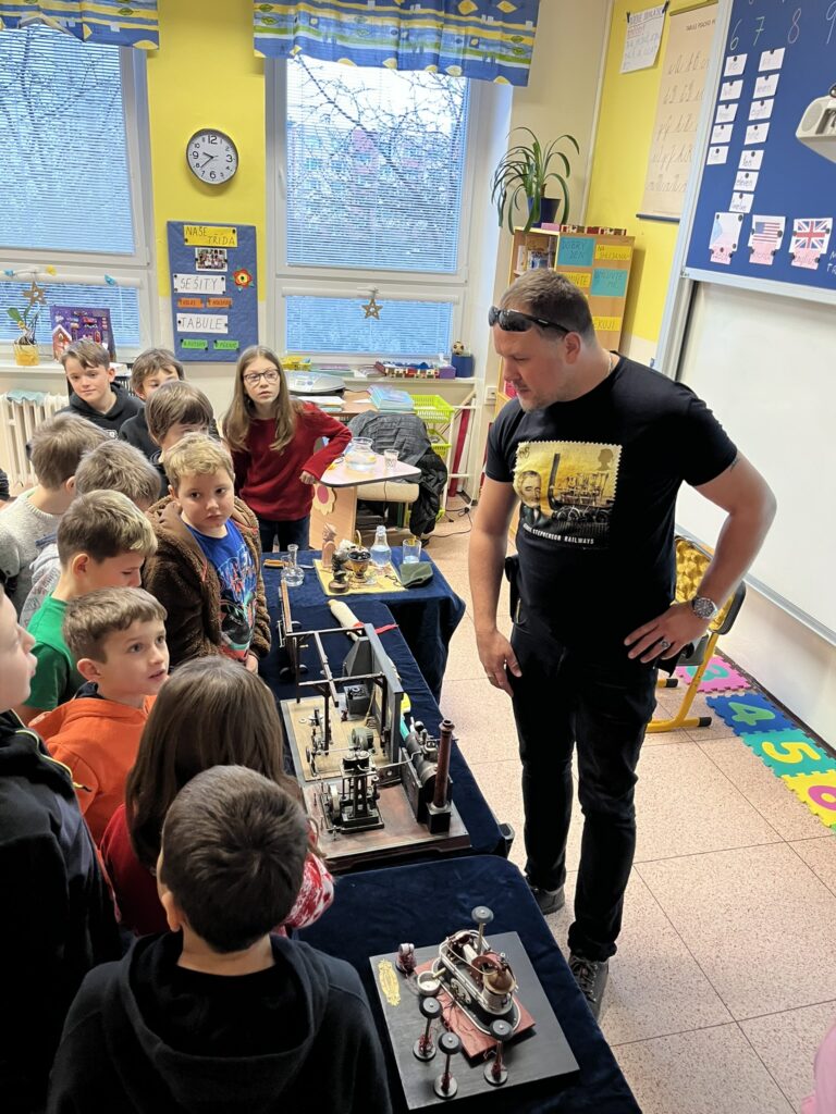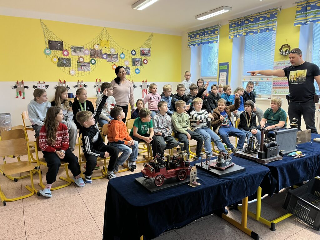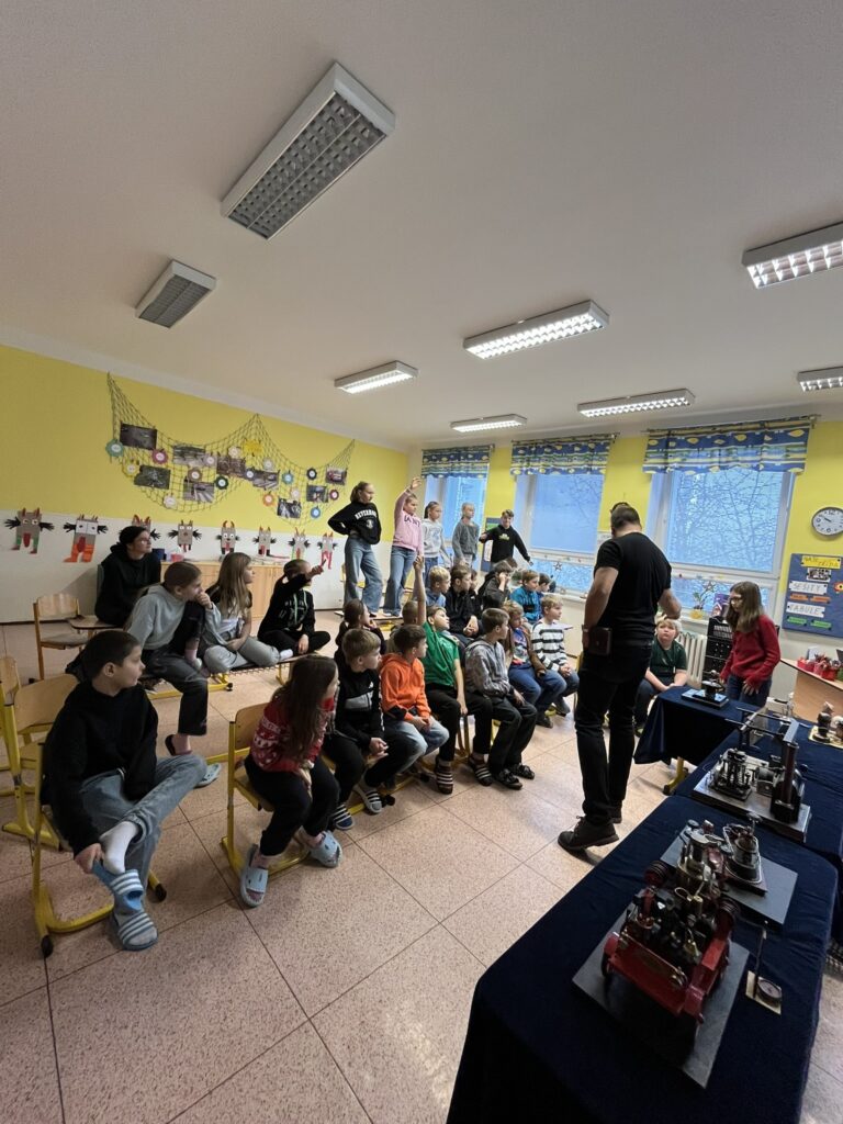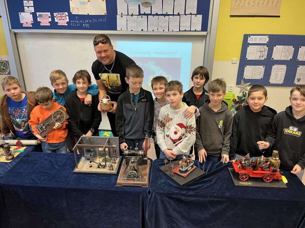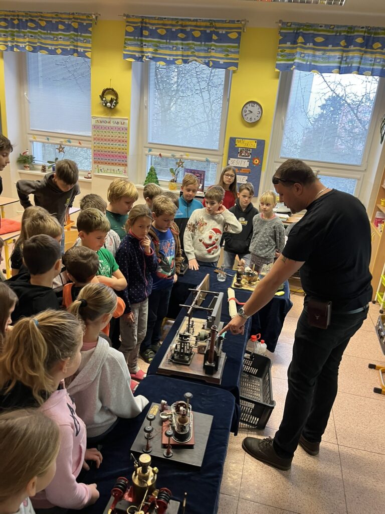 Na naší škole se uskutečnil koncem prosince vzdělávací program s názvem Plnou parou vpřed, který žákům poutavou a originální formou přiblížil fenomén parní energie a její význam v historii lidstva. Tento zábavně-poučný projekt nabídl jedinečný pohled na sílu páry prostřednictvím funkčních modelů, které názorně ukazovaly technický pokrok napříč dějinami. Programu se zúčastnily 3. a 5. třídy společně se třídou 4.B. Celým programem nás provázel Míla Vaváček, jehož nadšení pro téma a poutavý výklad významně přispěly k celkově velmi pozitivní atmosféře akce. Děti měly možnost nejen parní modely zkoumat, ale také se aktivně zapojit. Prezentace parních vynálezů vnesla do dnešní uspěchané doby nostalgické kouzlo starých časů a všichni v tu chvíli zapomněli na novodobou technologii.