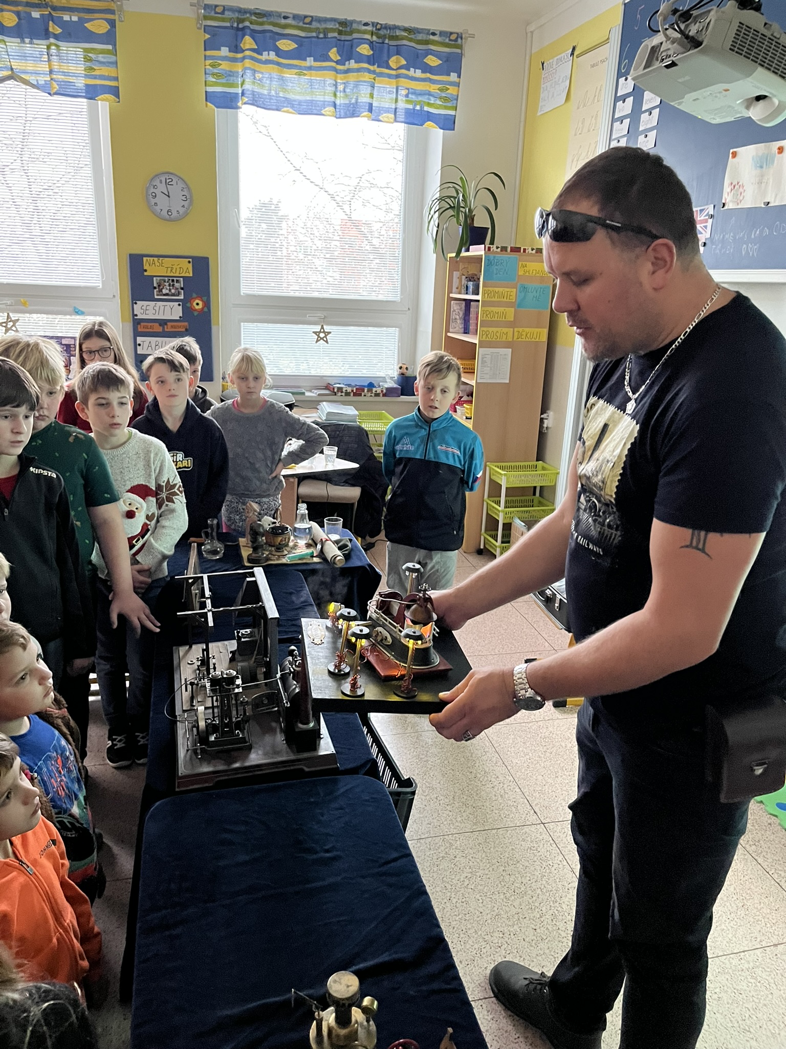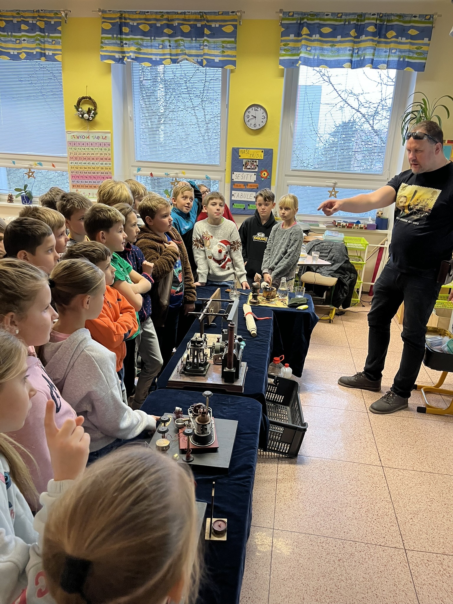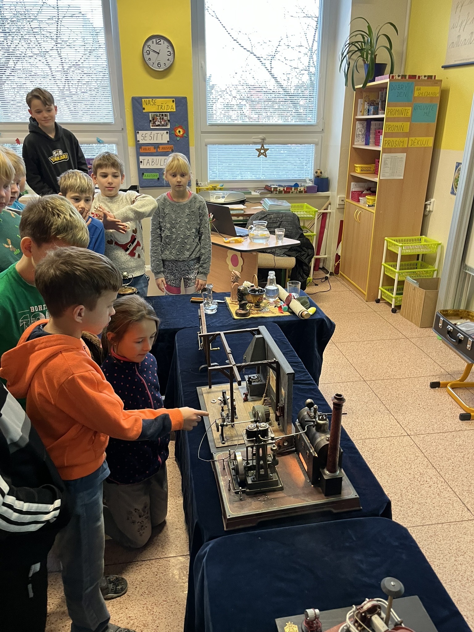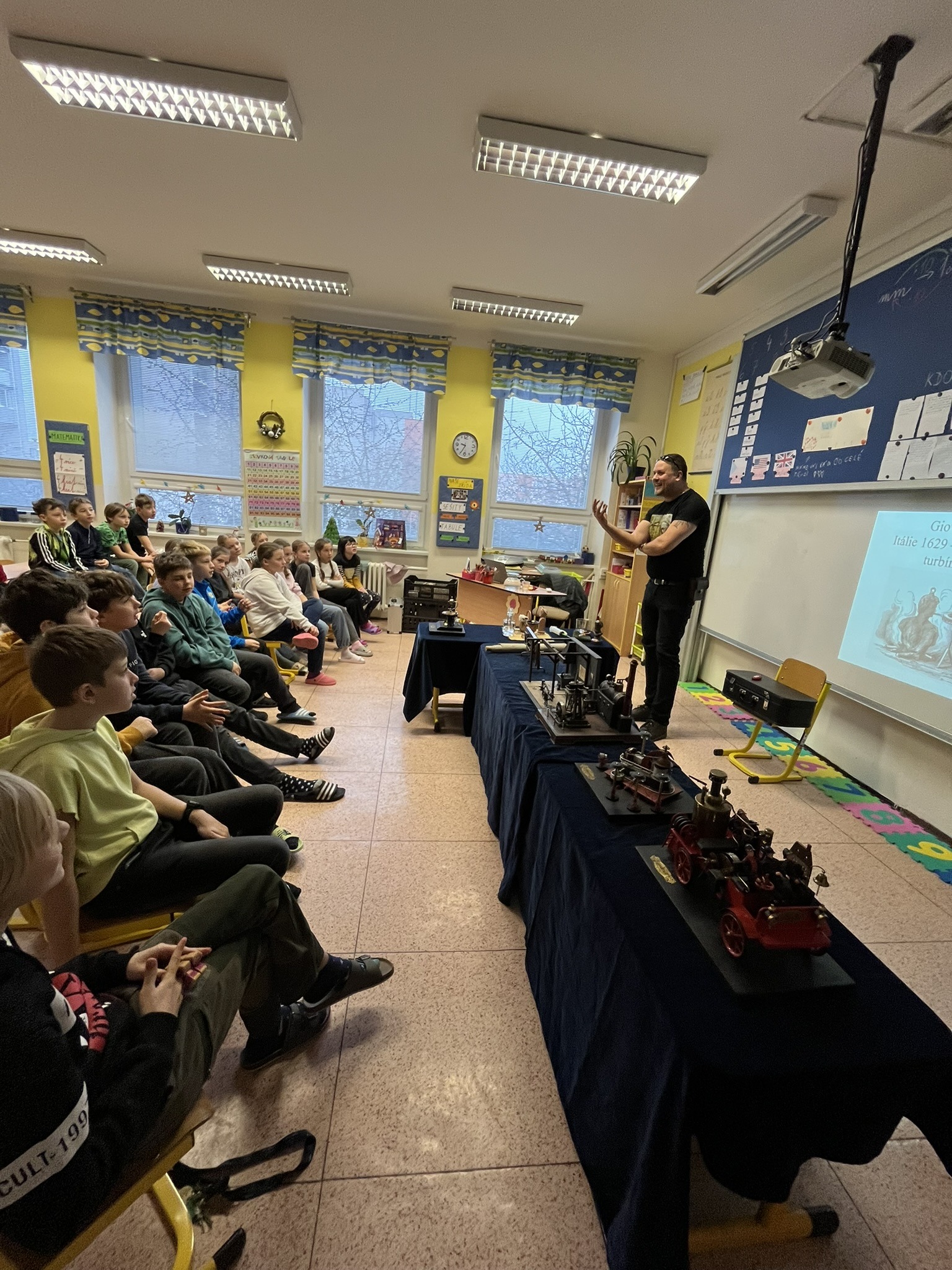 Na naší škole se uskutečnil koncem prosince vzdělávací program s názvem Plnou parou vpřed, který žákům poutavou a originální formou přiblížil fenomén parní energie a její význam v historii lidstva. Tento zábavně-poučný projekt nabídl jedinečný pohled na sílu páry prostřednictvím funkčních modelů, které názorně ukazovaly technický pokrok napříč dějinami. Programu se zúčastnily 3. a 5. třídy společně se třídou 4.B. Celým programem nás provázel Míla Vaváček, jehož nadšení pro téma a poutavý výklad významně přispěly k celkově velmi pozitivní atmosféře akce. Děti měly možnost nejen parní modely zkoumat, ale také se aktivně zapojit. Prezentace parních vynálezů vnesla do dnešní uspěchané doby nostalgické kouzlo starých časů a všichni v tu chvíli zapomněli na novodobou technologii.