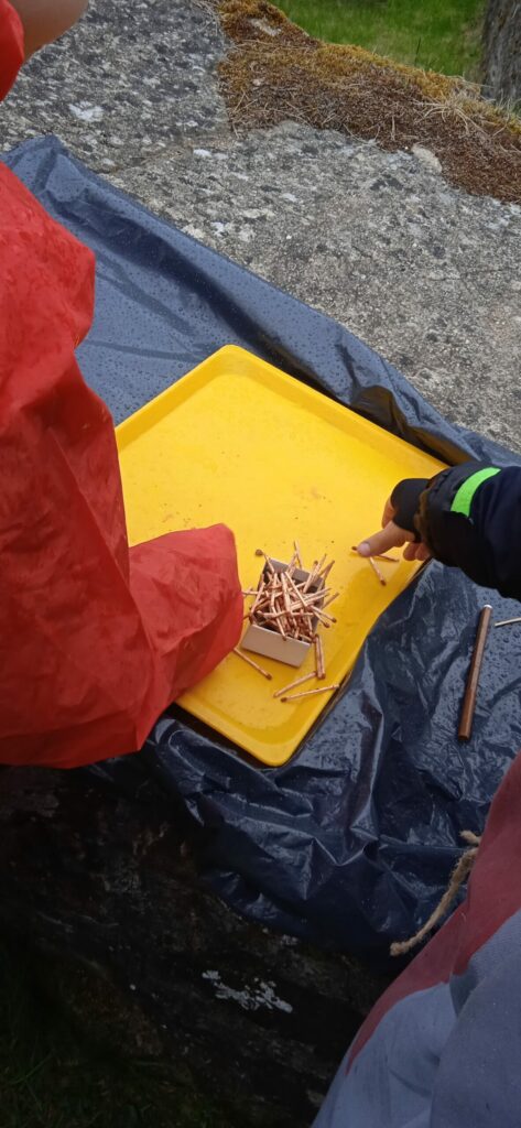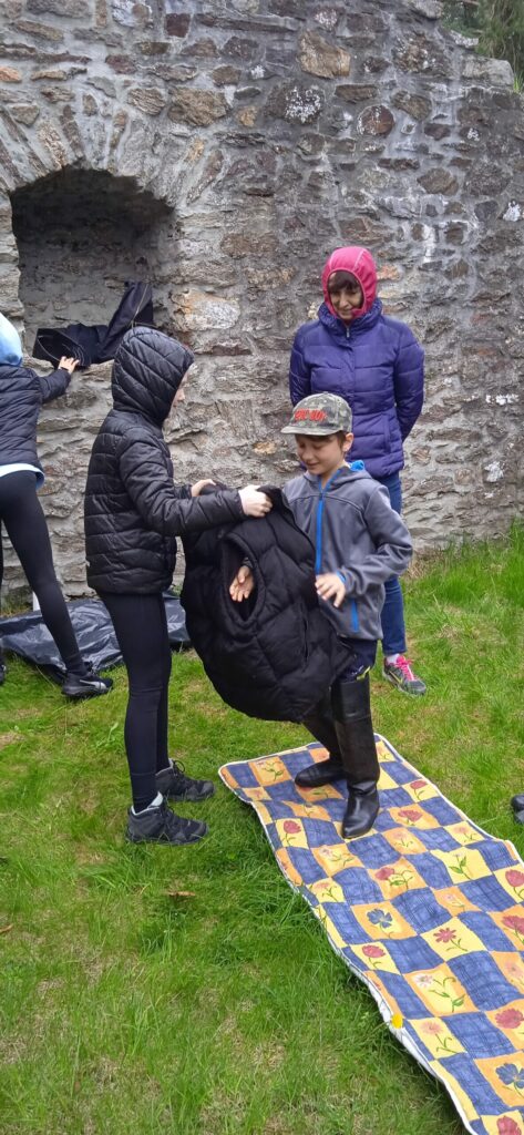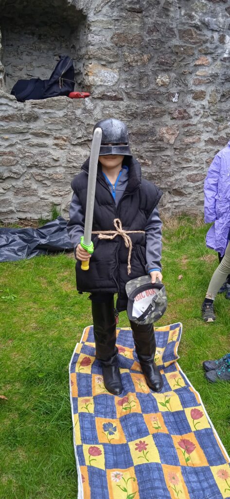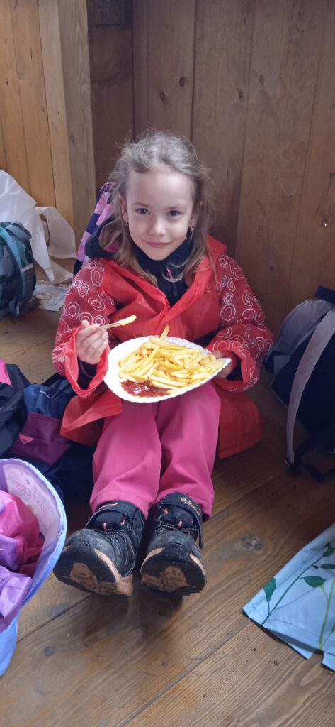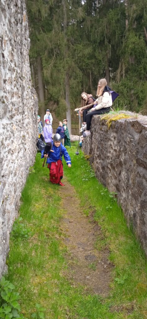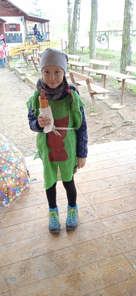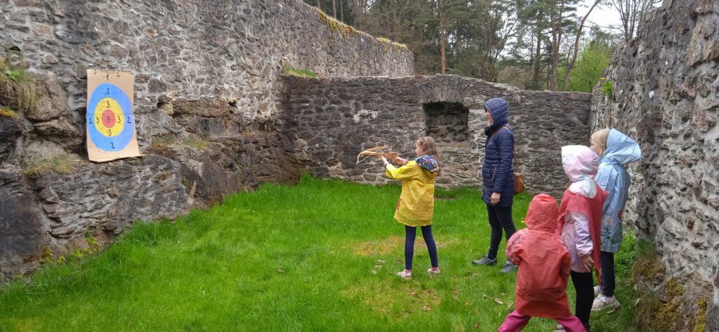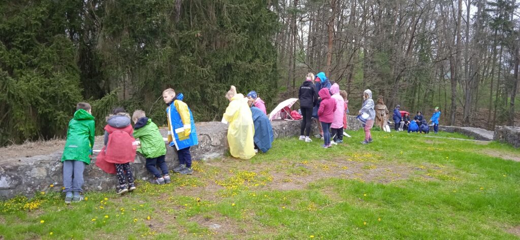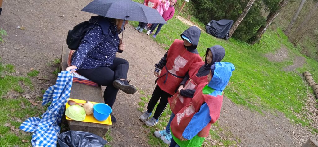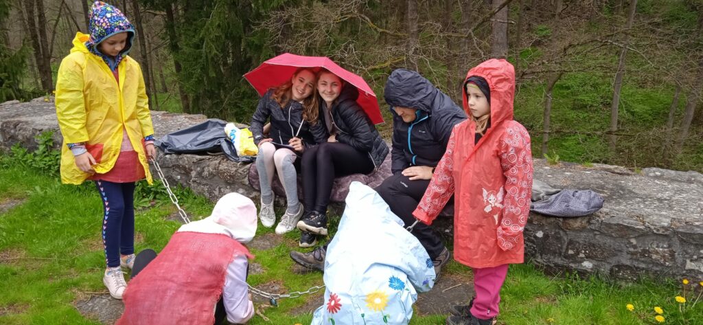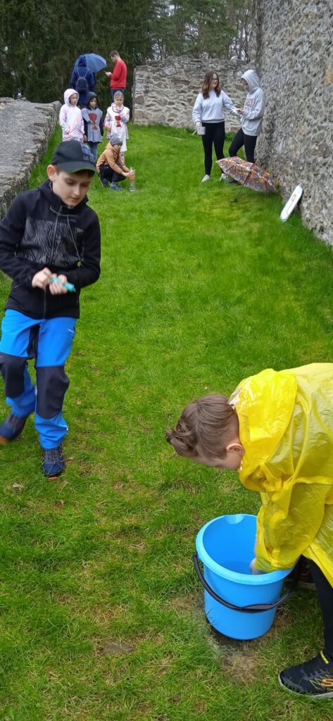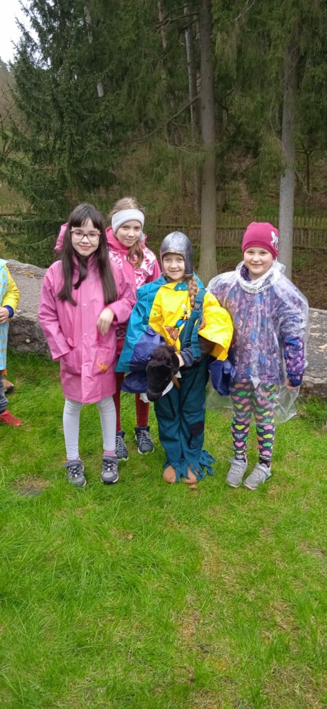 Letos nám počasí opravdu nepřálo a pláštěnky jsme vytáhli jen chvíli po zahájení cesty na hrad a nechali je na sobě celé odpoledne!!! Bohužel, i když nadšení dětí z akce bylo veliké, déšť taky!!! Prostor hradu se stal nevlídným a nebezpečným. Kvůli hrozícím úrazům, kluzkému prostředí a rozmáčeným rekvizitám jsme museli hru předčasně ukončit…To se nestalo za celou dobu pořádání této „celodružinovky“. Dospělým i dětem to bylo velmi líto, ale z hlediska bezpečnosti to nešlo jinak. Náladu jsme si zkazit nenechali! Po dobré svačince a dobrůtce z místní restaurace jsme se vrátili zpět do družiny a při čekání na rodiče si pohráli ještě ve třídě.