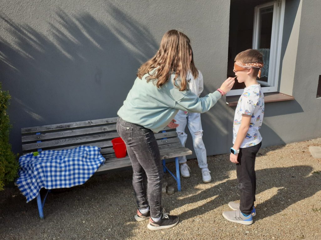 Kimova hra zaměřená na zrakové a sluchové vnímání, paměť, chuť, hmat a postřeh se odehrávala v prostorách školní zahrady. Probíhala od 13,00 do 14,30 hodin. Děti jako jednotlivci či ve skupinkách obcházely jednotlivá stanoviště a plnily úkoly – ochutnávku ovoce a zeleniny, doplňovaly rébusy a luštily přesmyčky nebo hmataly do váčku s překvapením, také se snažily si zapamatovat co nejvíce předmětů během časového limitu. I poznávačka rostlin a živočichů žijících v zahradách byla na odpoledním programu. Na jednom ze stanovišť jsme využili moderní technologii. Díky naskenování QR kódu z encyklopedie jsme poslouchali hlasy ptáků z naší zahrady…