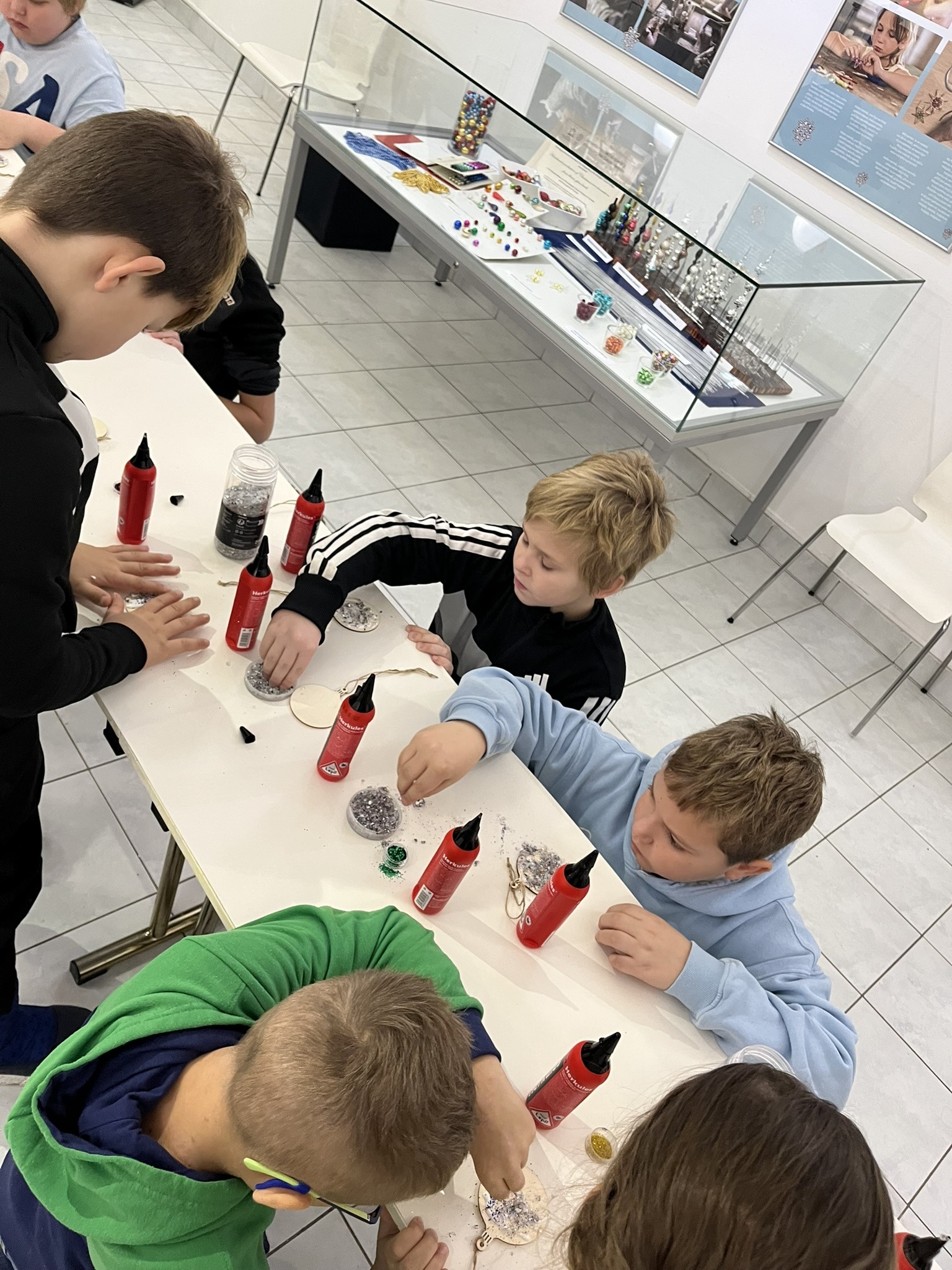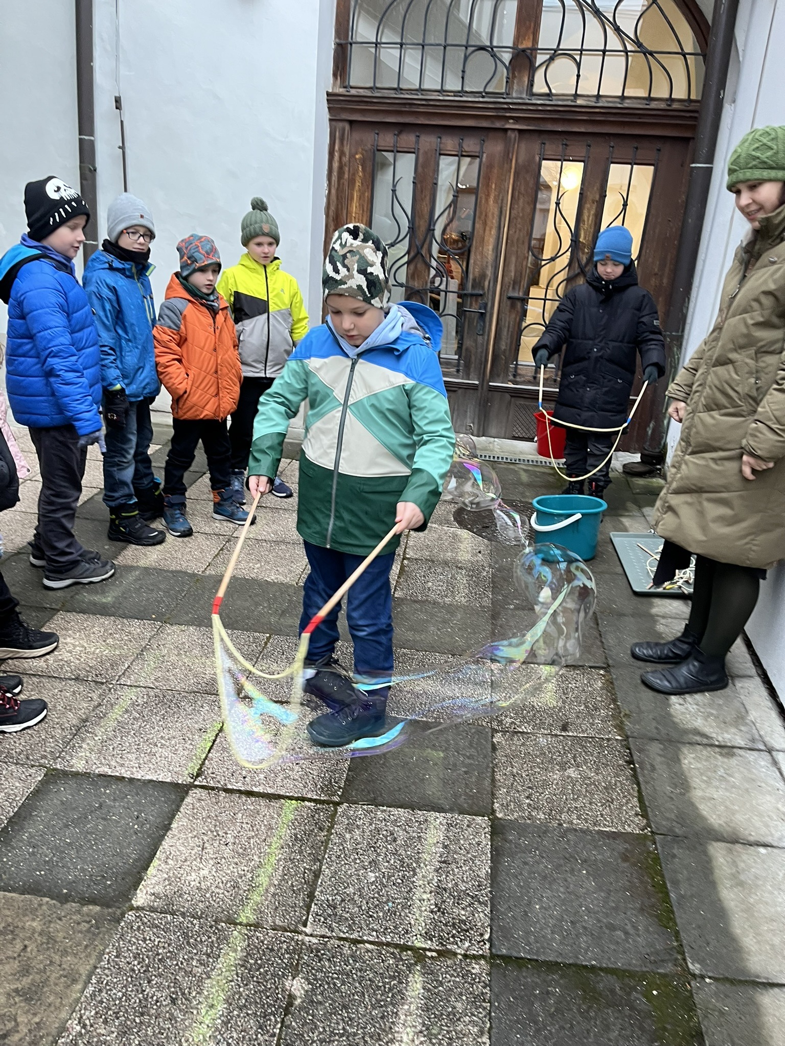 První prosincový den jsme se společně se třídami 3.A a 3.B vydali do Tábora, kde jsme navštívili Galerii 140. Zde pro nás byl připraven edukační program s názvem O stromečku a křehkosti. Nejprve jsme si prohlédli výstavu Skleněné Vánoce, kde jsme obdivovali množství vzácných skleněných ozdob a dozvěděli se, jak se tyto ozdoby v dávných dobách vyráběly. Následně jsme se sami pustili do tvorby ozdob – tentokrát dřevěných, které jsme zdobili třpytkami a skleněnými detaily. Viděli jsme i poutavé video, ve kterém bylo formou příběhu ukázáno, jak se lidé v horách díky daru od Krakonoše naučili vyrábět sklo, aby se mohli uživit. Poté jsme si ve venkovních prostorách galerie vyzkoušeli tvoření bublin, což mělo mezi dětmi velký úspěch.