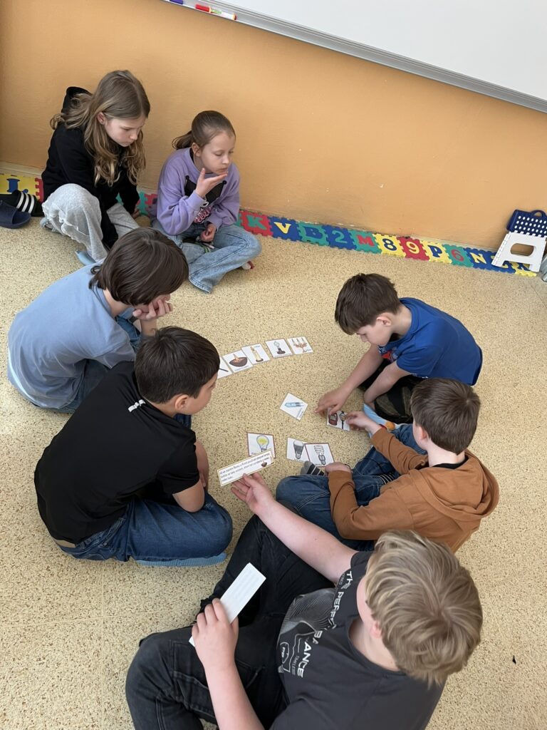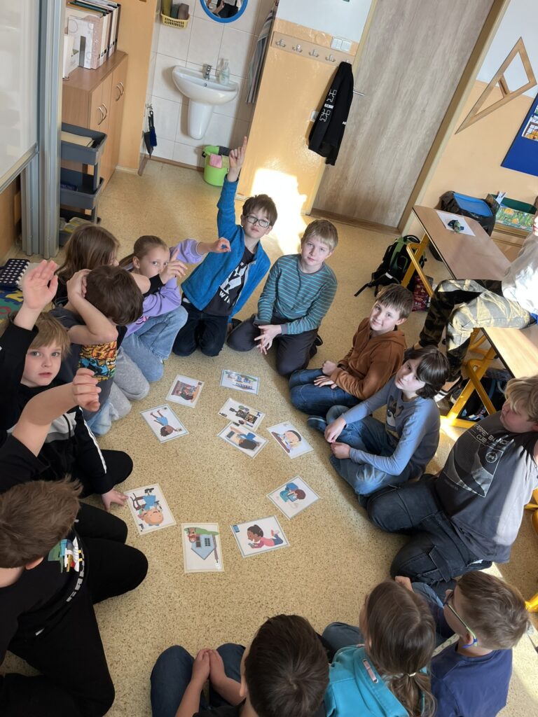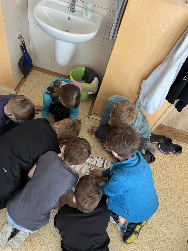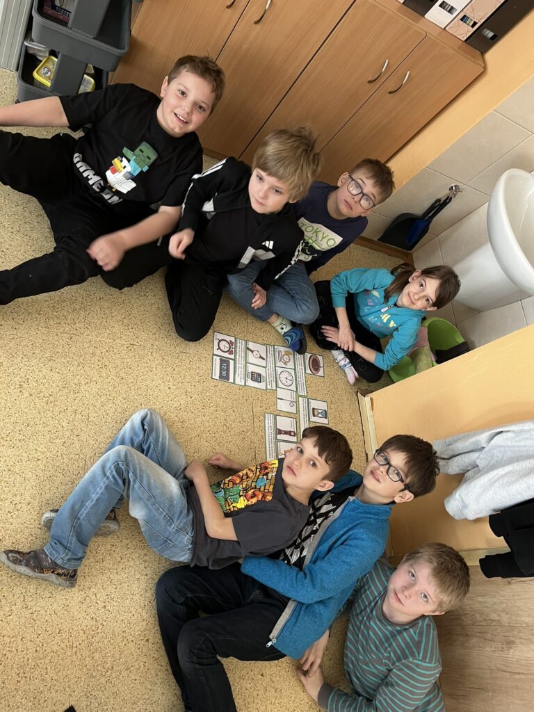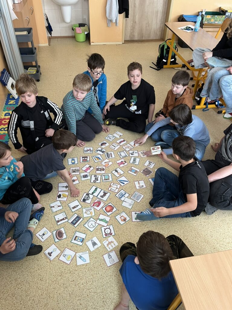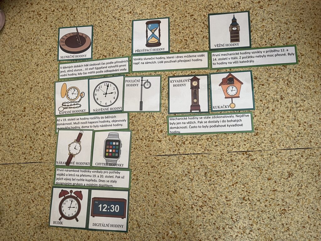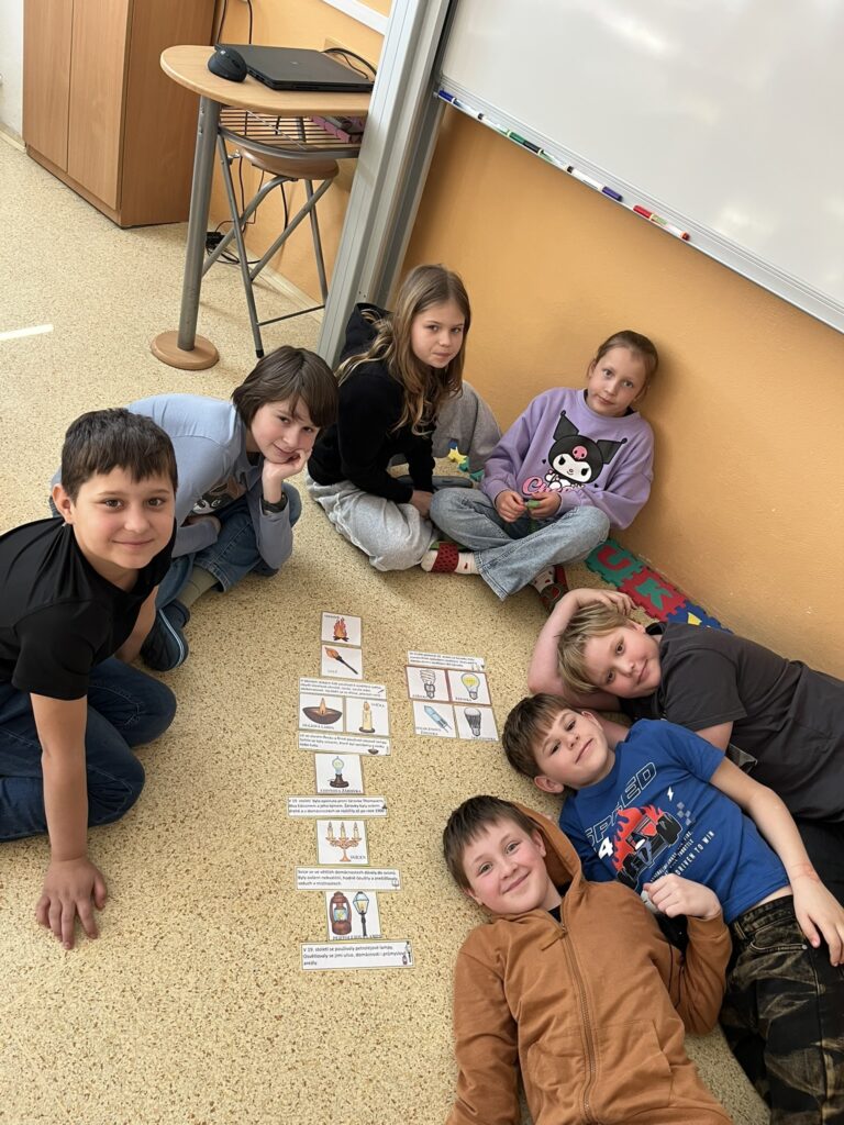 Součástí projektového dne bylo také sledování edukačních filmů o minulosti. Nové poznatky si žáci upevňovali pomocí skupinových her, hádanek a práce v pracovních listech. Celý den se nesl v příjemné atmosféře a děti pracovaly s velkým nadšením.