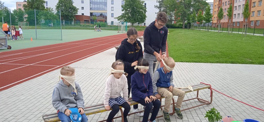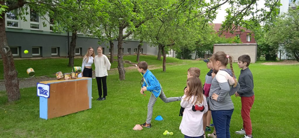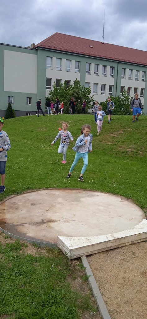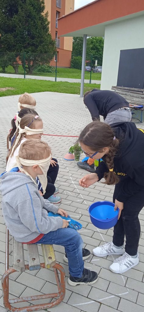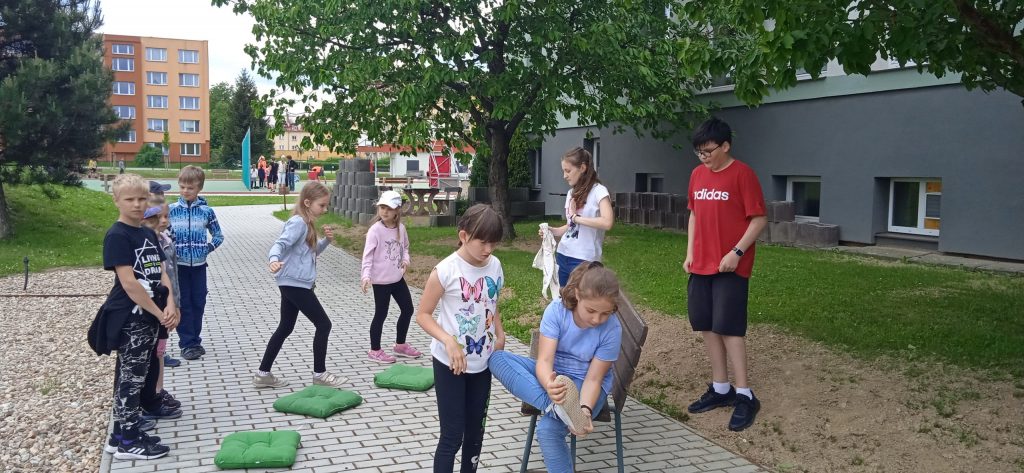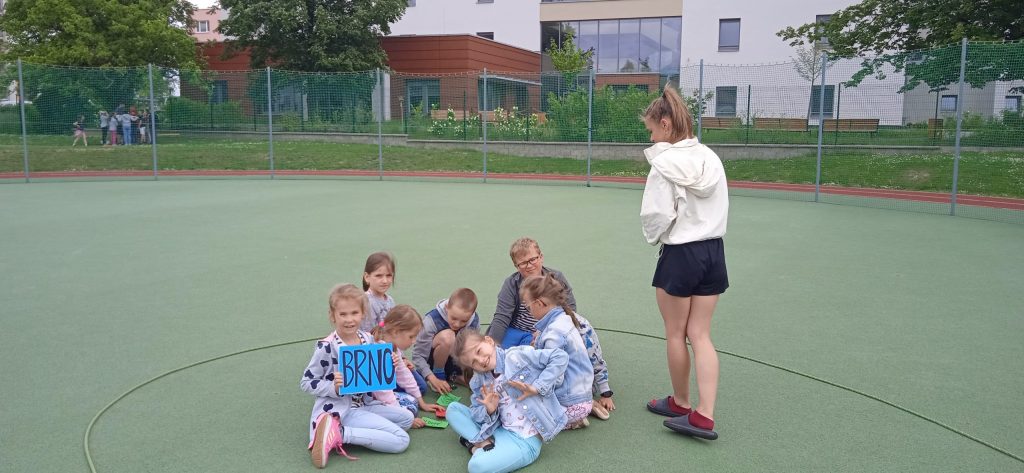 Hned na úvod je potřeba napsat, že se nám s našimi deváťáky a paní učitelkou skvěle spolupracovalo a že hra byla perfektně připravená, zaujala i nás dospělé a děti se moc dobře bavily! Prostor hřiště a sadu se proměnil v Čechy, Moravu a Slezko. Val, který máme na zahradě, tvořil pomyslnou hranici mezi Moravou a Čechami. Děti byly rozděleny do družstev. Ale pozor! Na přání organizátorů, to byla družstva smíšená, náhodně rozlosovaná. Tak, aby každý tým měl zástupce napříč ročníky a děti tak mohly své síly a zkušenosti spojit a uplatnit, případně si je i předat. Prostě, aby byl „boj“ vyrovnaný a spravedlivý. Napjatě jsme čekali, co děti na to. Rády si hrají v družstvech, ale se svými oblíbenými kamarády a v pátek se mohly ocitnout v týmu, kde neměly svého bližšího přítele. Tak i s tímhle, se „popraly“ skvěle! Nikomu to nevadilo a bylo vidět, že to nebrání ve hře a ani v nadšení dětí. Naopak, seznámení a spolupráce může přinést nová kamarádství. Družstva putovala po naší republice pěšky, se zastávkou v českých, moravských a slezských městech. A tak si děti mohly zarybařit v Třeboni, v Praze hádaly hádanky, v Plzni si zahrály fotbal a v Ostravě se pracovalo. Bažinu překonávaly na Kvildě a v Brně luštily místní nářečí. Znojmo a Olomouc byly ve znamení ochutnávek bylinek, koření a dalších pochutin. Město Zlín versus Sezimovo Ústí nesly tradici Tomáše Bati a házelo se zde holinou, Tábor byl ryze husitský a srážely se plechovky. Úkolem dětí bylo projít všechna zmíněná města a plnit zadané úkoly. Jako bonus bylo i to, že se dozvěděly informace o těchto místech. Nejen tedy příprava a organizace her byla na starších spolužácích, ale i seznámení dětí se zajímavostmi, historií či přírodou jimi zvolených měst . A zvládli to bravurně, citlivě a zajímavě vzhledem k věku žáků z 1. stupně.