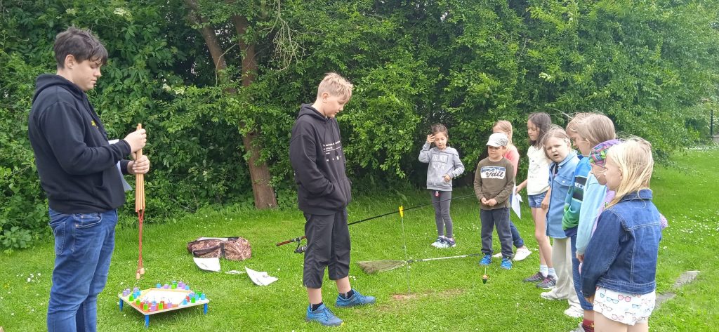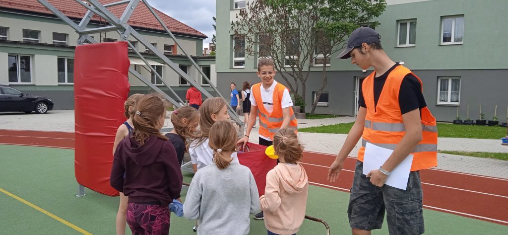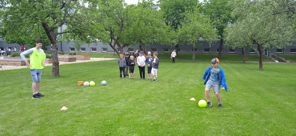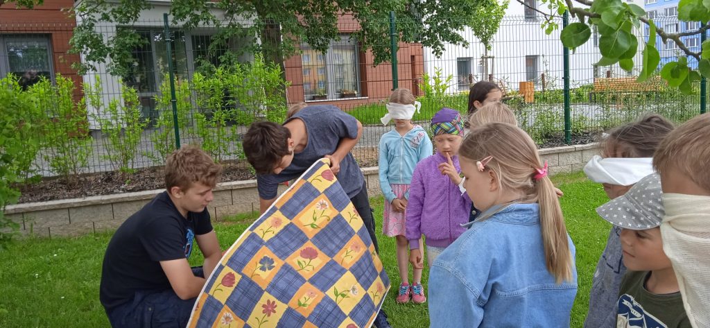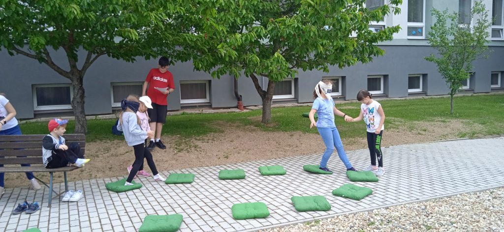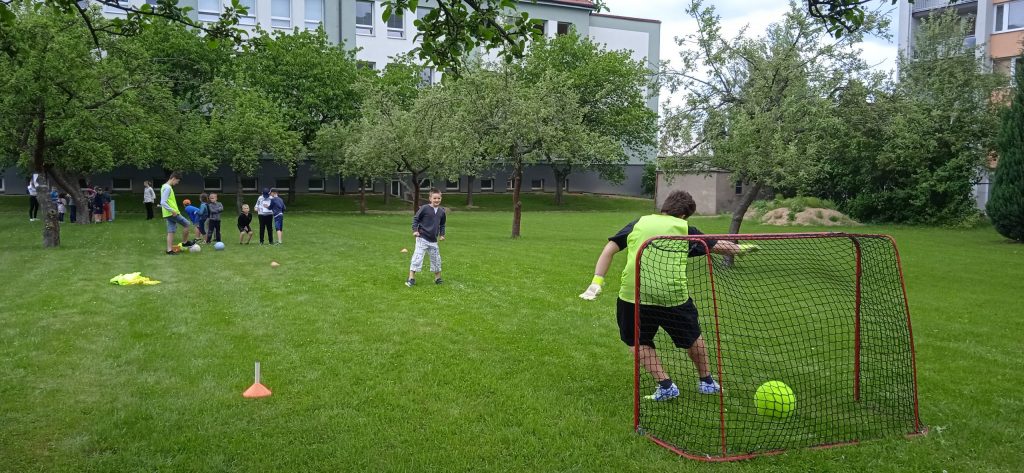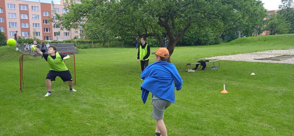Hned na úvod je potřeba napsat, že se nám s našimi deváťáky a paní učitelkou skvěle spolupracovalo a že hra byla perfektně připravená, zaujala i nás dospělé a děti se moc dobře bavily! Prostor hřiště a sadu se proměnil v Čechy, Moravu a Slezko. Val, který máme na zahradě, tvořil pomyslnou hranici mezi Moravou a Čechami. Děti byly rozděleny do družstev. Ale pozor! Na přání organizátorů, to byla družstva smíšená, náhodně rozlosovaná. Tak, aby každý tým měl zástupce napříč ročníky a děti tak mohly své síly a zkušenosti spojit a uplatnit, případně si je i předat. Prostě, aby byl „boj“ vyrovnaný a spravedlivý. Napjatě jsme čekali, co děti na to. Rády si hrají v družstvech, ale se svými oblíbenými kamarády a v pátek se mohly ocitnout v týmu, kde neměly svého bližšího přítele. Tak i s tímhle, se „popraly“ skvěle! Nikomu to nevadilo a bylo vidět, že to nebrání ve hře a ani v nadšení dětí. Naopak, seznámení a spolupráce může přinést nová kamarádství. Družstva putovala po naší republice pěšky, se zastávkou v českých, moravských a slezských městech. A tak si děti mohly zarybařit v Třeboni, v Praze hádaly hádanky, v Plzni si zahrály fotbal a v Ostravě se pracovalo. Bažinu překonávaly na Kvildě a v Brně luštily místní nářečí. Znojmo a Olomouc byly ve znamení ochutnávek bylinek, koření a dalších pochutin. Město Zlín versus Sezimovo Ústí nesly tradici Tomáše Bati a házelo se zde holinou, Tábor byl ryze husitský a srážely se plechovky. Úkolem dětí bylo projít všechna zmíněná města a plnit zadané úkoly. Jako bonus bylo i to, že se dozvěděly informace o těchto místech. Nejen tedy příprava a organizace her byla na starších spolužácích, ale i seznámení dětí se zajímavostmi, historií či přírodou jimi zvolených měst . A zvládli to bravurně, citlivě a zajímavě vzhledem k věku žáků z 1. stupně.