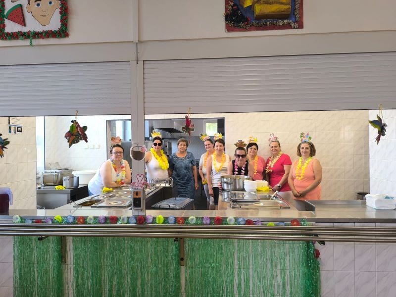 Léto vítají i naše paní kuchařky a to opět stylovou výzdobou, letním nealko drinkem a tolik oblíbeným “hambáčem”…věřte, že nejen naši žáci mají proměny školní jídelny a kostýmy kuchařek rádi, oceňují je i dospělí strávníci a my zaměstnanci školy. Vždyť humor je koření života a kdo má  humor, má všechno… Kdo jste nemohl spatřit naživo, zhlédněte alespoň ve fotogalerii…
